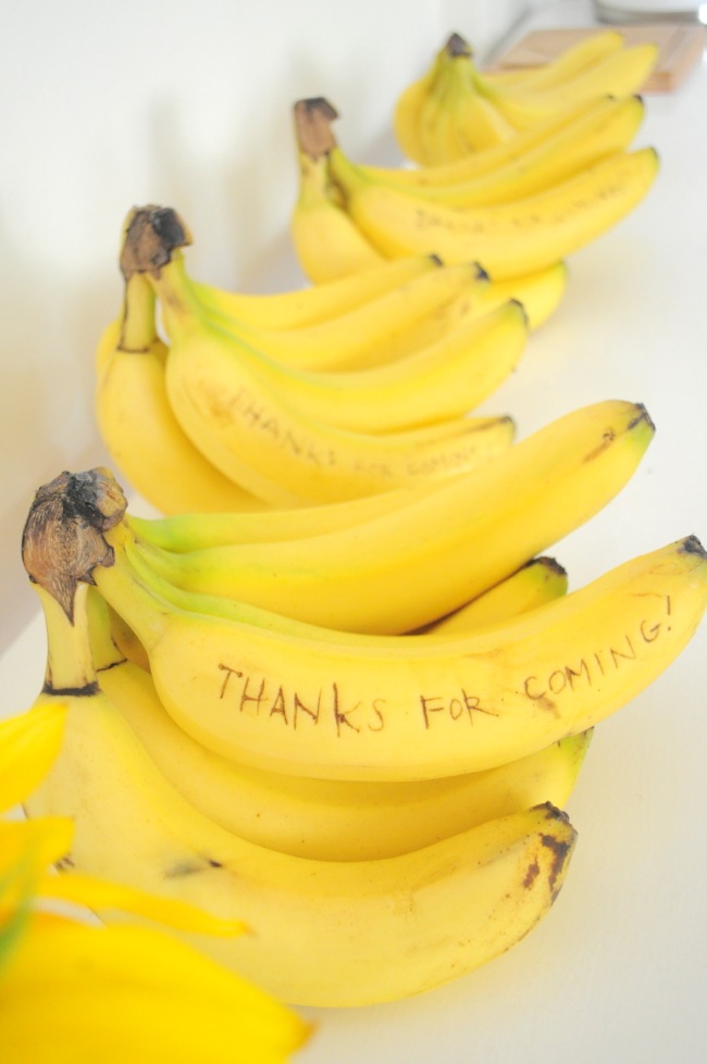 For favors we gave out bunches of bananas! What else?! I scratched the message on with a toothpick. I’m kicking myself for not writing “thanks a bunch!” How did I miss such a perfect pun? Oh well.