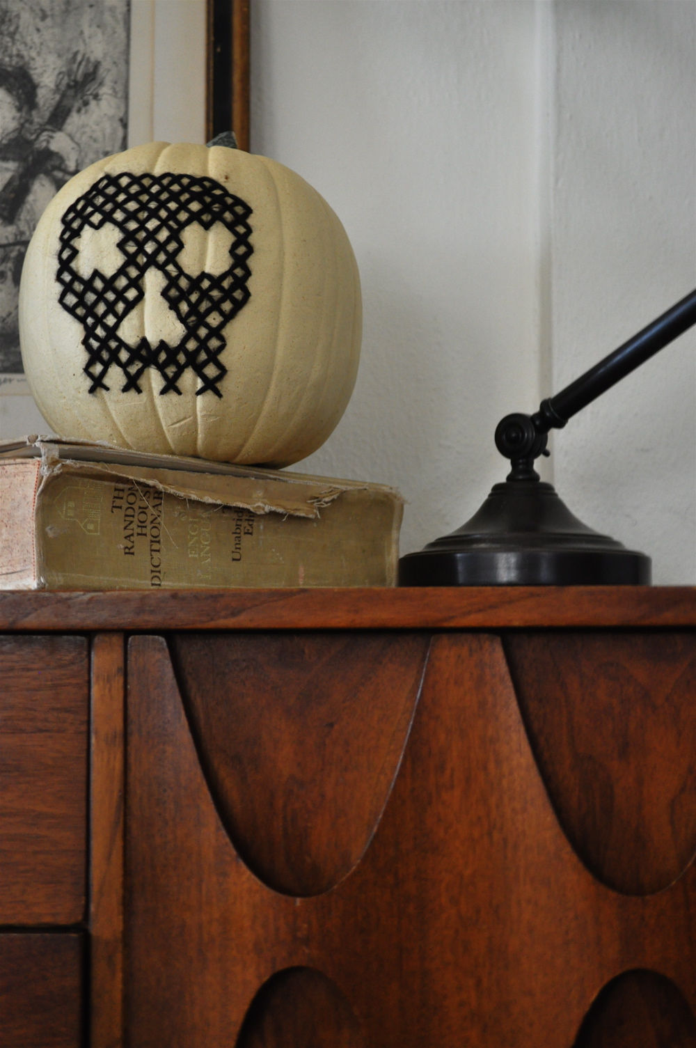This idea came about when Abbey from Aesthetic Outburst threw a fabulous birthday party with a “hand-stitched/granny chic theme” and as one of the decorations she painted a cross stitch design on a pumpkin.ย The whole party was beautiful, but this idea was extra awesome and I thought maybe I could cross stitch for real on a fake pumpkin. The project turned out even better than I hoped and so I’m sharing it with you. I know there are only 5 days until Halloween, but this is a quick-ish project and the pumpkins will last forever.