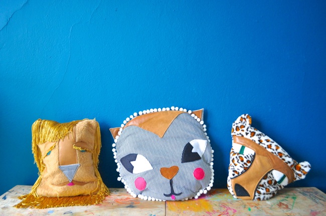 My youngest has been obsessed with cheetahs for what seems like forever now. So of course I had to make him a cheetah pillow. Like the real thing, this cheetah has tear lines–the lines that run from his eye to his chin. Black piping worked perfectly! And the leather I used–on all the animals–gives it a beautiful texture. My 4 year old cheetah approves.