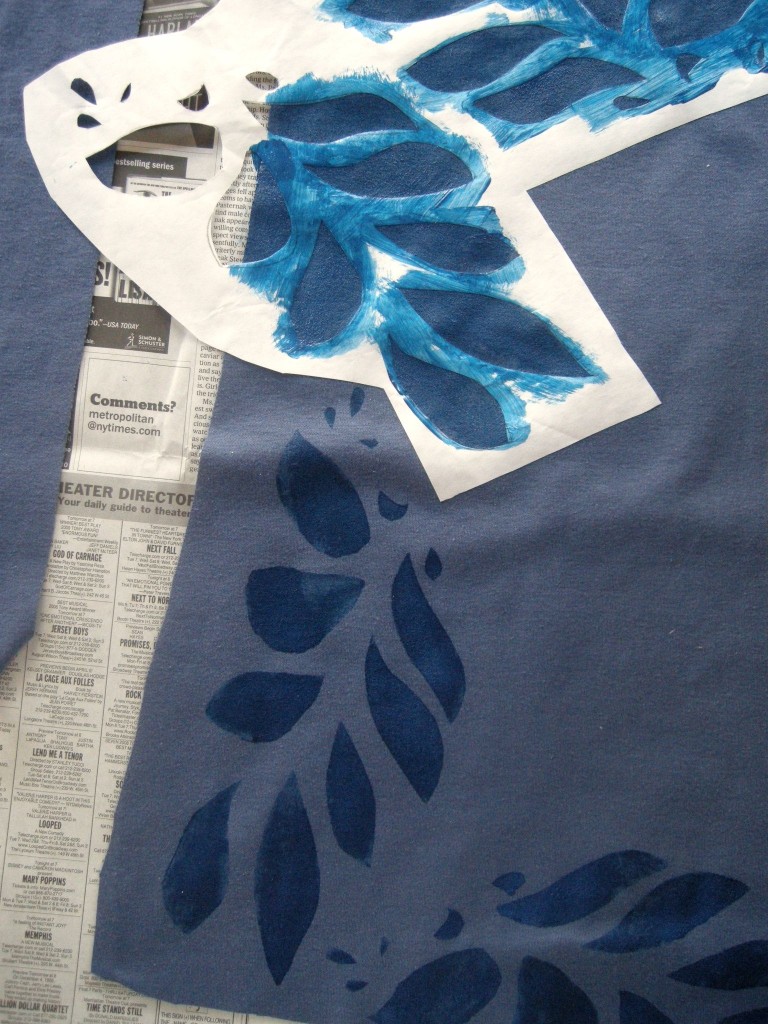 When I was making this skirt I didn’t want to cut 20 or 30 leaf stencils, so I cut 3 and used them over and over again. I couldn’t wait for the stencils to dry between uses (time is precious! the baby is napping!) so I put another piece of freezer paper over the stencil, plasticy side down, and ironed over both. Then I gently peeled the top freezer paper off and voila! the stencil was ready to use again. The paint was still wet on the stencil, but as long as there are not glops of it, it won’t come of or bleed onto your fabric. The stencil might come loose a little in places when you peel off the top sheet, but this is the lazy man’s way after all, if you want perfect, well then do it your way miss perfect.