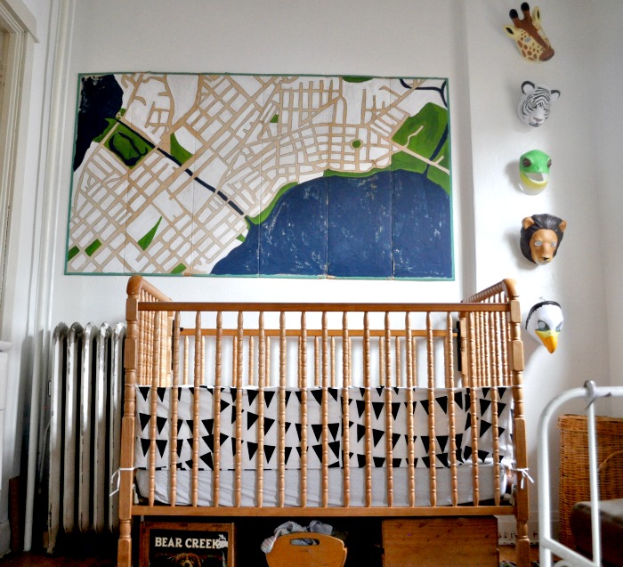 The baby’s bed is across from the clouds. Above the crib is a map of our neighborhood that I painted. It still needs street names and the railroad track and the bike path painted in, but it’s a work in progress–mostly because I can’t do while the baby is sleeping! I picked up the the masks at our local art supply shop and they work for dress up and decoration (a twofer). There are wooden boxes under the crib for storage (that I talked about here) and the hamper was a lucky thrift store find.