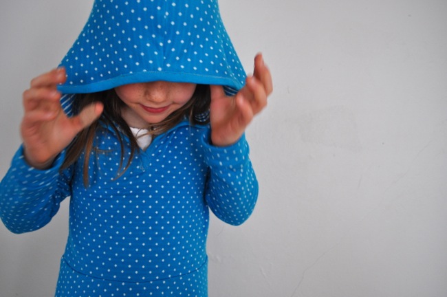 The original pattern is a crew neck, but I couldn’t imagine it without a hood. Luckily for me, Rae recently posted a hoodie tutorial that was a perfect match for this dress. I made the placket a little shorter so I wouldn’t have to add buttons or snaps. She does have to wear something under it, but I expected that.