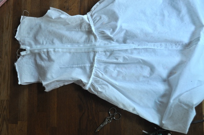 1. the zipper: The little strip of plastic we all dread. I knew it was coming up and the damn thing was making me nervous. I have done zippers successfully before, but this was an invisible zipper. An invisible zipper is like a regular zipper folded up weird. First you have to undo the weirdness with an iron, then you can put it in–this involves more muscle than you would expect. :)