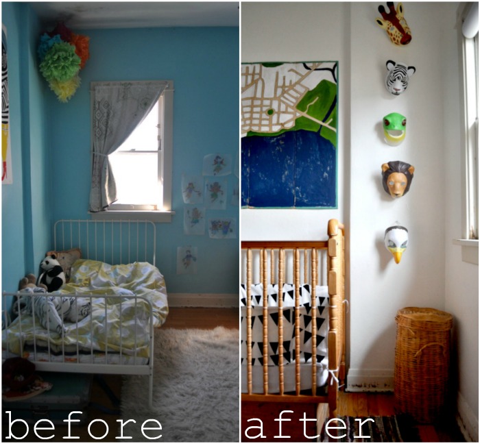 This room was a nursery, then two toddlers’ bedroom and now three happy sibling share it! So here is a little bonus before & after with a before-the-before photo in there: